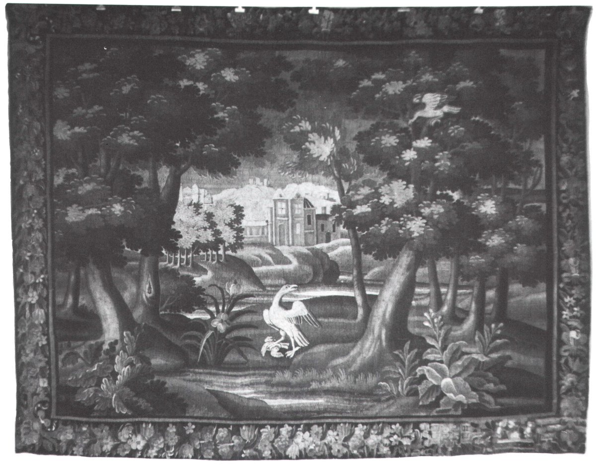 Tapisserie d'AUBUSSON, XVIIIe. Verdure animée d'un château au ruisseau, avec un rapace agrippant un oiseau. Bordures à fleurs. Haut. 235, Long. 310 cm.