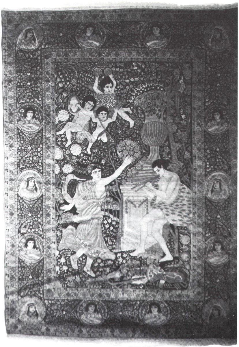 Original et très beau tapis KIRMAN ancien, fin XIXe. Représentant un jeune homme jouant de la flûte à sa bien-aimée, avec de jeunes enfants jouant des cymbales et du tambourin. Fond bleu marine à fleurs et arbres fleuris, vase, instruments de musique. Importante bordure à médaillon, reprenant le visage de sa bien-aimée dans des médaillons.