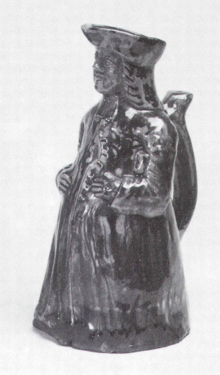 POT JACQUELINE en faïence vernissée de couleur en camaïeu ocre, représentant un magistrat, ecclésiastique (?) à bicorne (accid.). Art populaire ancien. Haut. 27 cm. Porte étiquette: Exposition Musée des Arts Décoratifs, 1932.