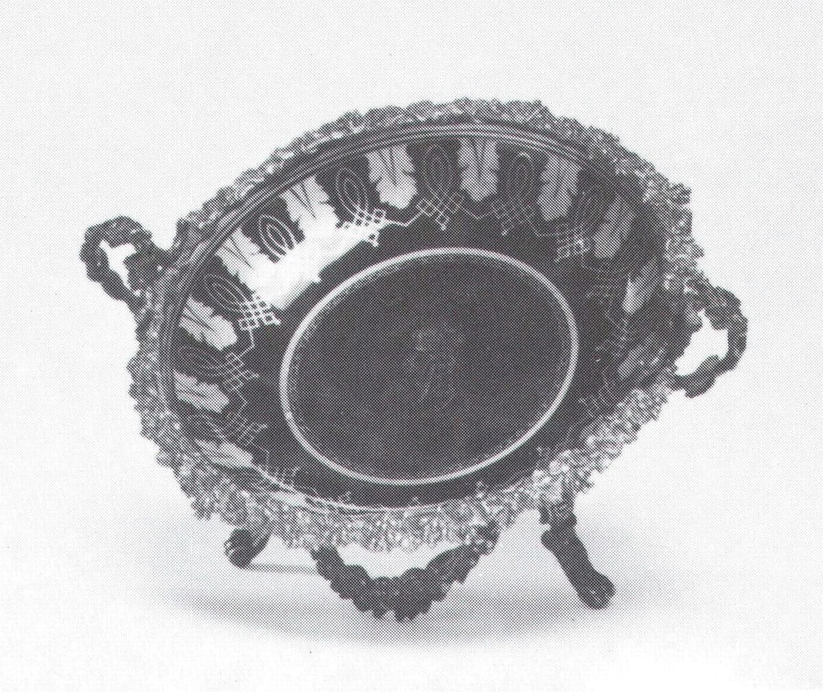 COUPE montée en porcelaine de SÈVRES, à décor bleu roi, rehaussé d'entrelacs et palmettes stylisées à la feuille d'or. Chiffre du roi Louis¬Philippe couronné en son centre. Monture en bronze doré et ciselé de feuillage et de fruits. Marque de fabrication : Sèvres, 1843. Haut. 12,5, Diam. 24 cm.