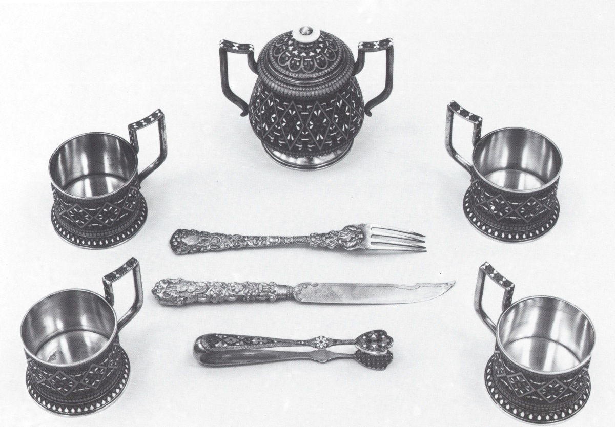 MÉNAGÈRE DE TABLE : douze fourchettes et douze couteaux sur manches fourrés en vermeil, à branches, spatules et manches ciselés de rinceaux, fleurs, personnages, masques et hommes en cuirasse s'appuyant sur un écusson gravé d'un monogramme surmonté d'une couronne princière. Travail russe exécuté entre 1908 et 1917. (Un couteau cassé, variantes.) Poids brut de l'ensemble avec les manches fourrés, 2,180 kg.