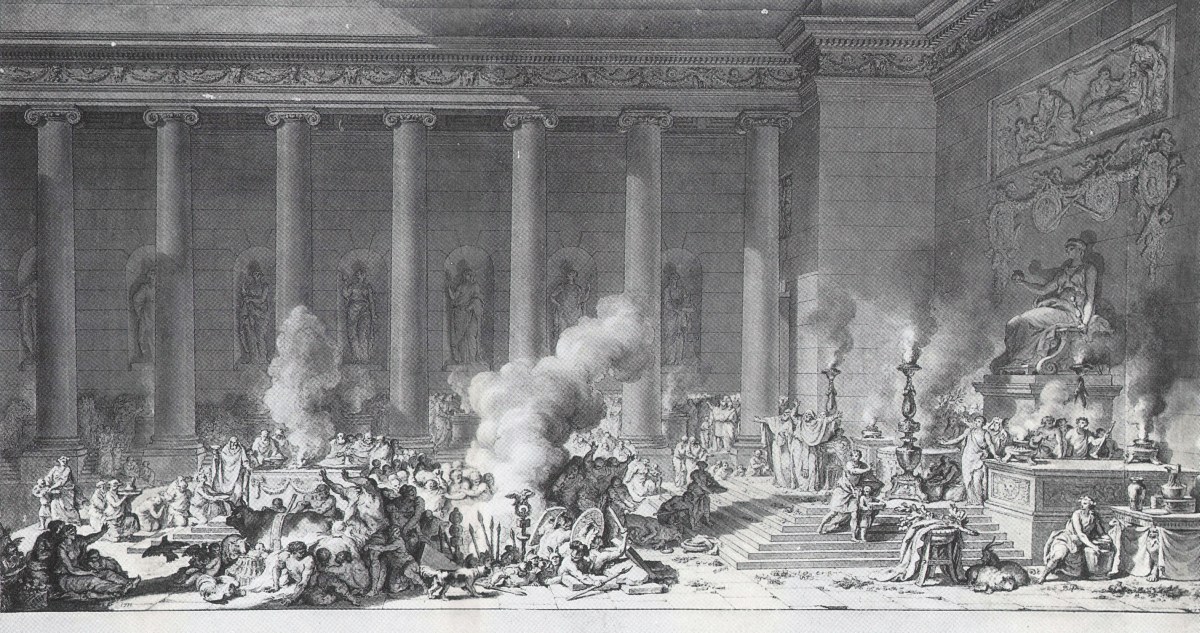 Augustin PAJOU (Paris, 1730-1809). "Camillus assiégeant la ville de Veyes en Toscane, ses soldats par son ordre avaient miné sous le temple de Junon. Ils y paraissent au moment où les veyens offraient un sacrifice, jettent l'effroi parmi le peuple et se saisissent des entrailles de la victime pour les porter à Camillus". Plume, lavis d'encre de Chine et rehauts de blanc. Signé et daté 1771 en bas à gauche. Exposé au salon de 1771.