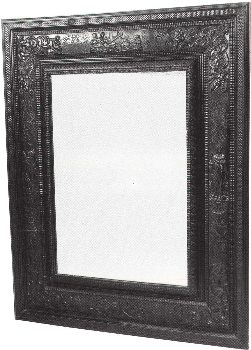 Exceptionnelle GLACE en ébène à décor de scènes mythologiques, d'amours: Poséidon sur un char tiré par des dauphins. Mars aux attributs guerriers. Décor gravé de rinceaux, de fleurs de tulipe et de paniers de fruits. Epoque Louis XIV. Travail inspiré de œuvres de J. MACE.