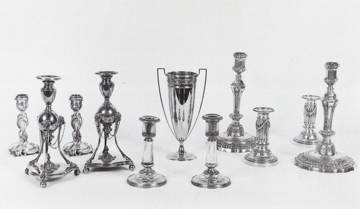 PAIRE DE FLAMBEAUX bas en argent de forme balustre à décor de rocaille et de feuillages, reposant sur une terrasse feuillagée. Style Louis XV.