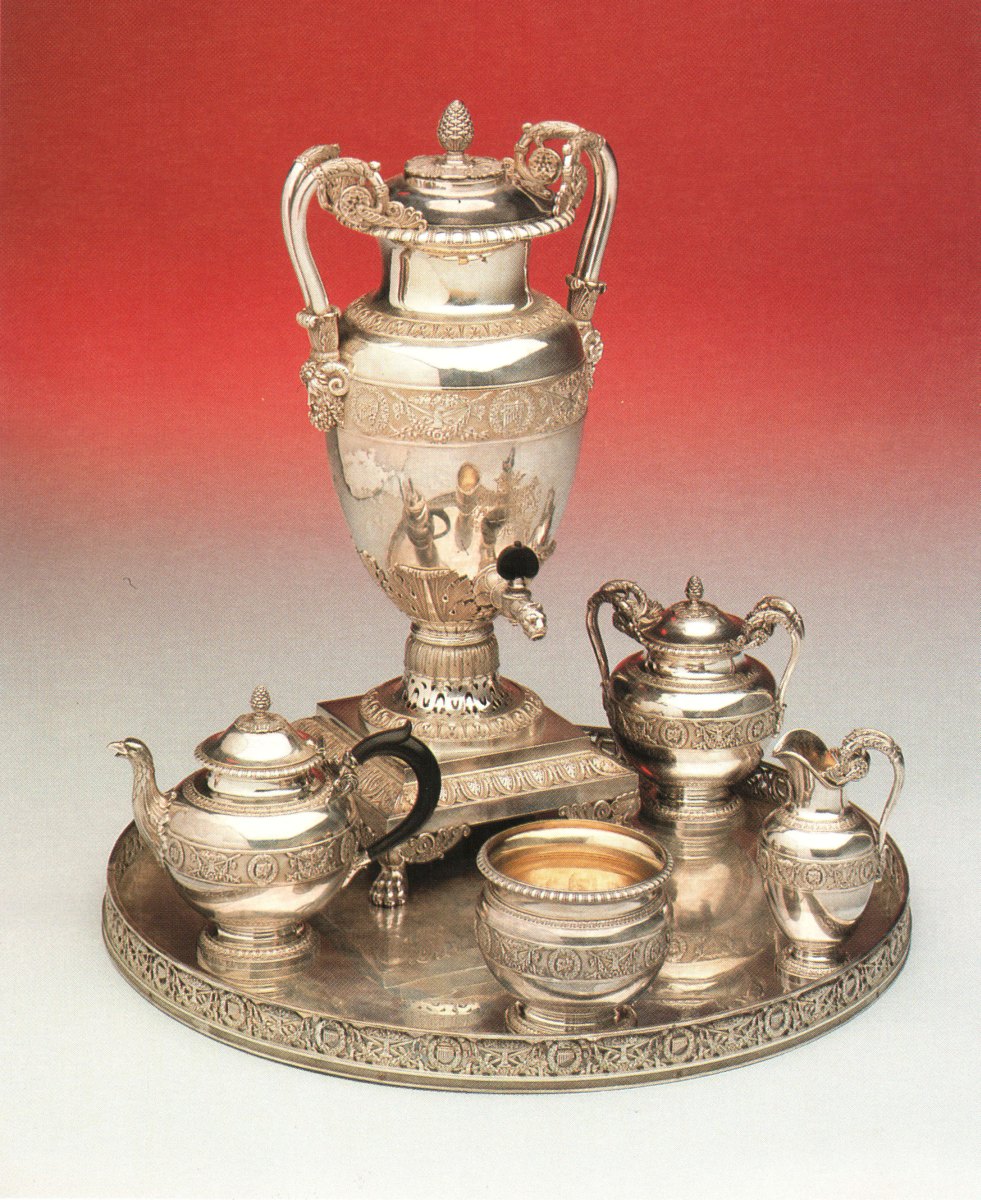 Sous Napoléon III, Aucoc aîné a repris les formes et le décor de Fauconnier (bandeau, iconographie) pour assortir ce service à thé à la fontaine de l'époque Restauration.