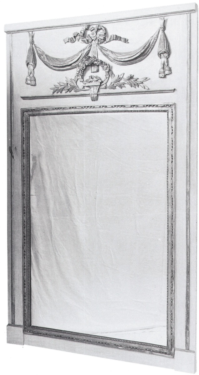 GLACE-TRUMEAU en bois relaqué et redoré, à décor iconographique de l'époque Louis XVI : draperie, feuilles de chêne, nœuds, guirlandes de fleurs et colombes. Époque Louis XVI. (restauration).