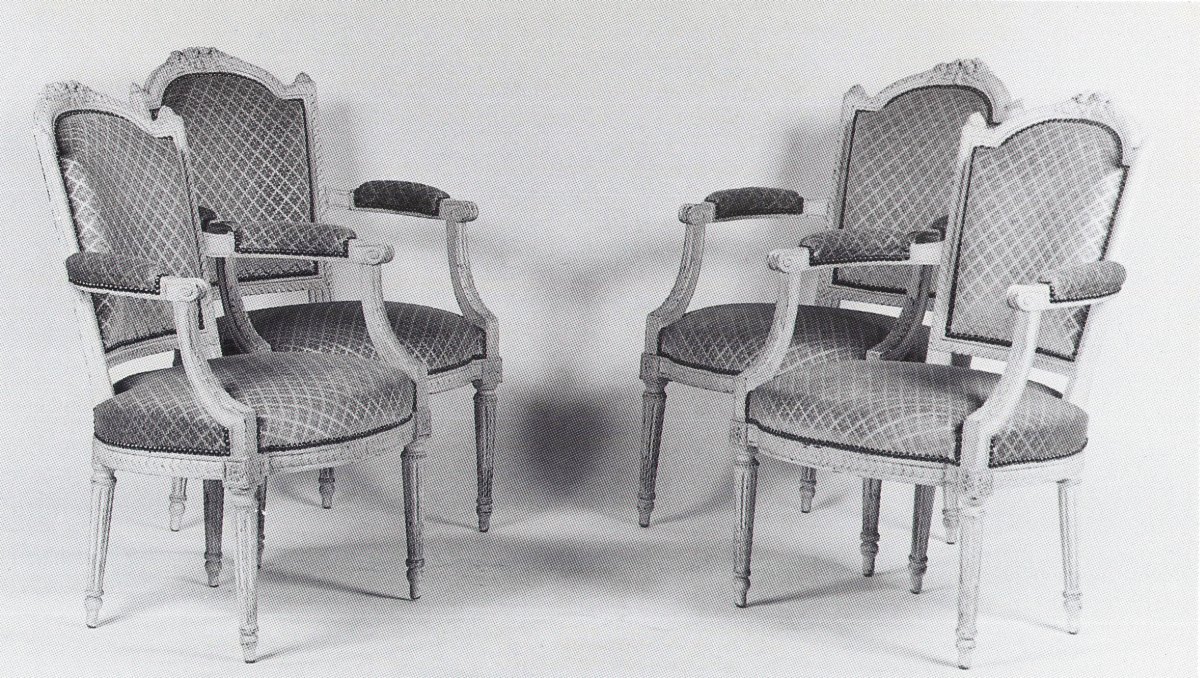 Suite de QUATRE FAUTEUILS cabriolets à chapeau de gendarme en bois laqué blanc et rechampi bleu, richement moulurés et sculptés : cannelure à pointe d'asperge, perles. quatre feuilles, rais de cœur, acanthes, panaches et bouquets de fleurs champêtres. Époque Louis XVI. Suite inspirée des grands menuisiers de Louis XVI : BOULARD, SENÉ...