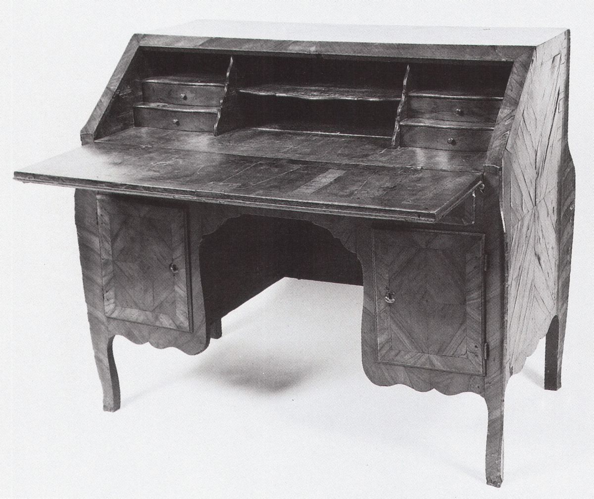 150 BUREAU de pente en bois de placage, ouvrant à un abattant qui dissimule quatre tiroirs et des casiers, et par un tiroir et deux vantaux en façade. Pieds légèrement cambrés. Époque Louis XV. Travail provincial du XVIIIème.