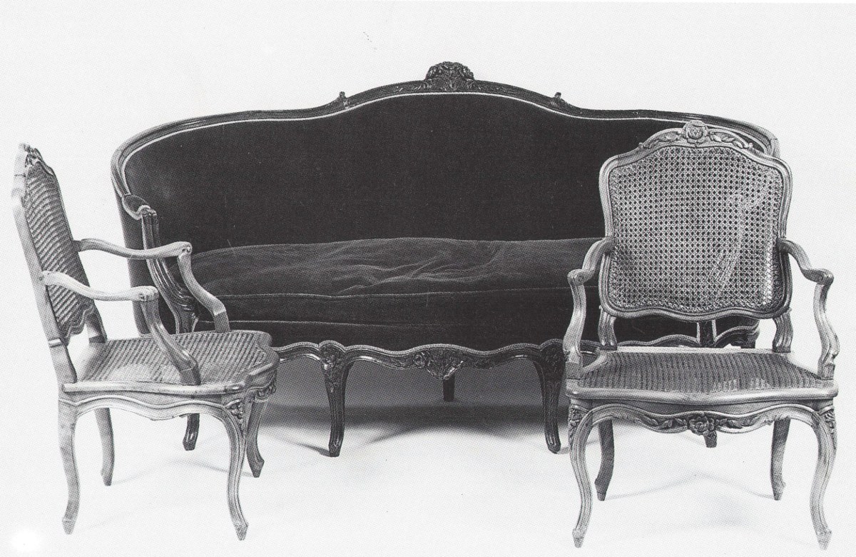 PAIRE DE FAUTEUILS en noyer à dossier à la reine et fond canné, richement décoré et sculpté d'ornements floraux, accotoirs et supports d'accotoirs en coup de fouet, pieds au galbe accentué de moulures. Estampillés NOGARET à LYON. Époque Louis XV. Pierre NOGARET, reçu Maître en juin 1745 à Lyon.