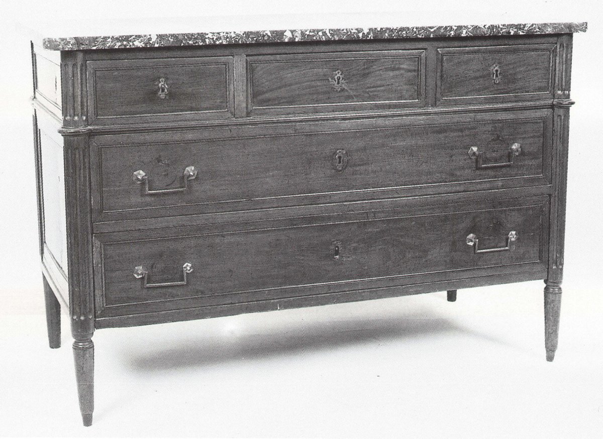 COMMODE en acajou et placage d'acajou ouvrant par trois rangs de tiroirs, dont trois dans la partie supérieure. Montants arrondis cannelés, pieds fuselés. Dessus de marbre gris Sainte Anne. Époque Louis XVI, fin du XVIIIème.
