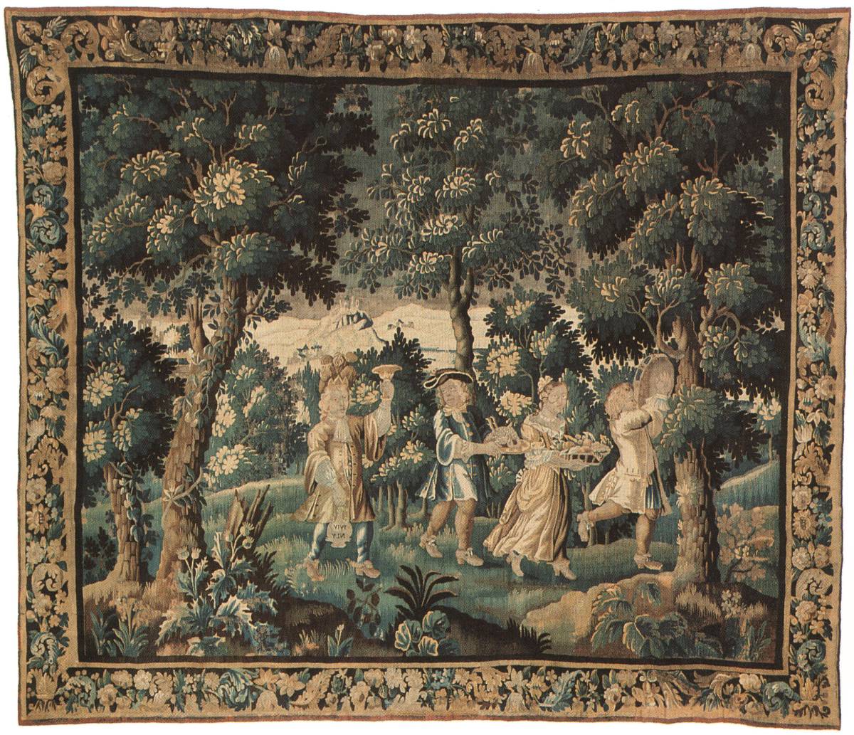 Exceptionnelle TAPISSERIE de la Manufacture Royale d'AUBUSSON, XVIIIème siècle. Verdure à quatre petits personnages chantant et dansant aux bienfaits de la table : joueur de tambourin, porteurs de plats et de vin. Bordures à fleurs et rinceaux.