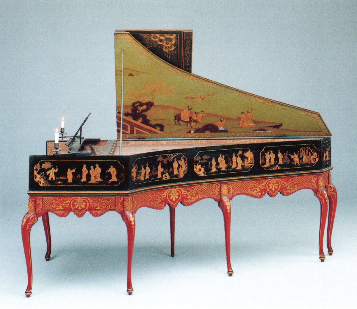 Le piétement d'origine, à sept pieds galbés, a un décor laqué de rinceaux et de coquilles à la Bérain, or sur fond rouge corail. Il comporte, comme c'est souvent le cas, un tiroir latéral.