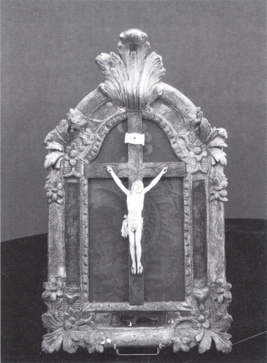 CHRIST en os-ivoire (?) dans un cadre à parcloses en bois sculpté et doré à décor de feuilles d'acanthe et de fleurettes. Fond tissu rouge.