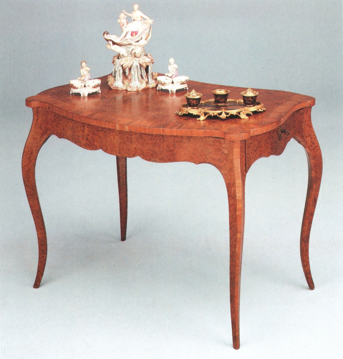 TABLE DE SALON (ou dite de milieu) en placage de ronce ou de loupe de bois indigène, placage de bois de violette. De forme mouvementée, elle ouvre à deux tiroirs latéraux. Belle fluidité et sinuosité du galbe du piétement.