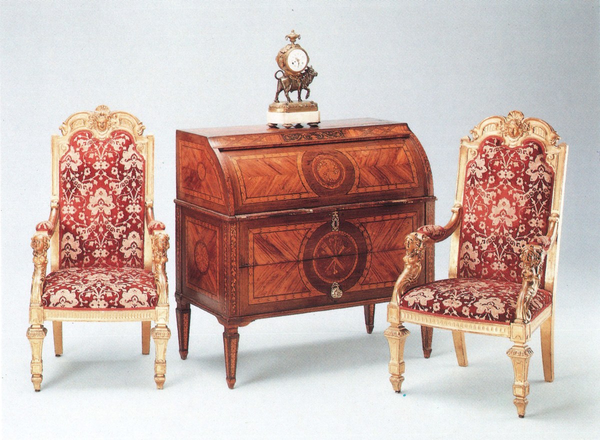 SECRÉTAIRE CYLINDRE ouvrant à deux tiroirs dans la partie inférieure et un arrondi dissimulant des rangées de tiroirs. Bois de placage de palissandre et marqueterie de bois de couleur: important décor de torses de lauriers et de motifs à feuillage dans des médaillons circulaires. Arabesques et croisillons avec raies de cœur stylisées. Montant, pieds gaines avec marqueterie florale.