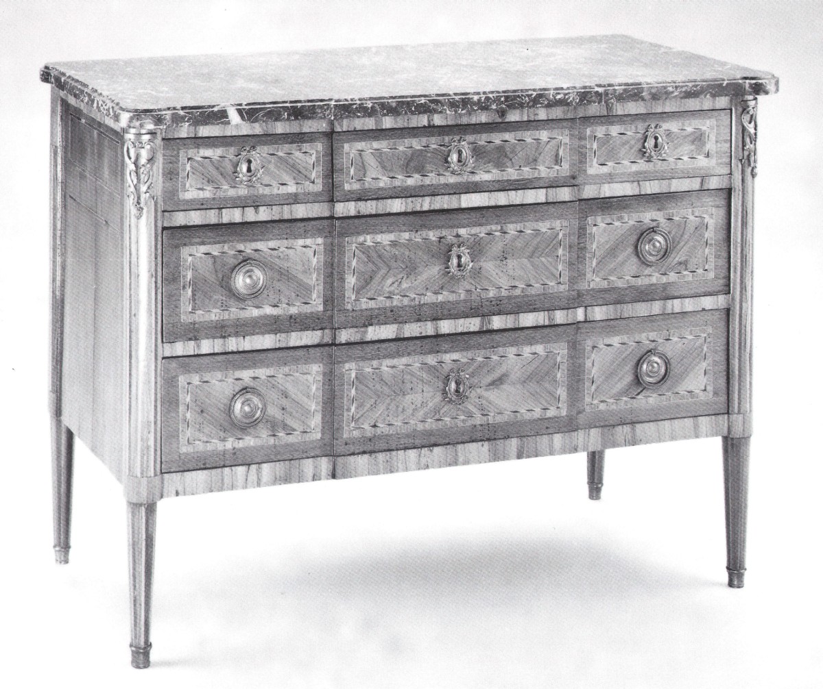 COMMODE à léger ressaut central à décor de marqueterie de motifs géométriques en bois contrasté. Elle ouvre à trois rangs de tiroirs dont trois dans la rangée supérieure. Montants avant arrondis. Piétement fuselé. Ornementation en bronze: entrées de serrure, poignées de tirage, chutes en ceinture et sabots. Dessus marbre gris Sainte-Anne.