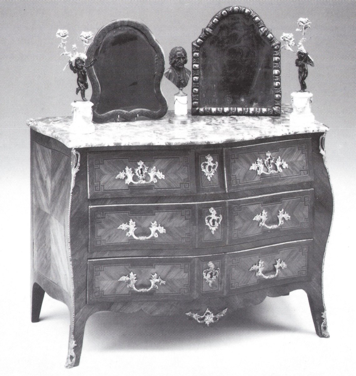 PAIRE DE CANDÉLABRES à deux lumières en bronze ciselé, doré et patiné. Angelots virevoltant, tenant une branche fleurie. Socle en marbre blanc à draperies retenues par des nœuds.