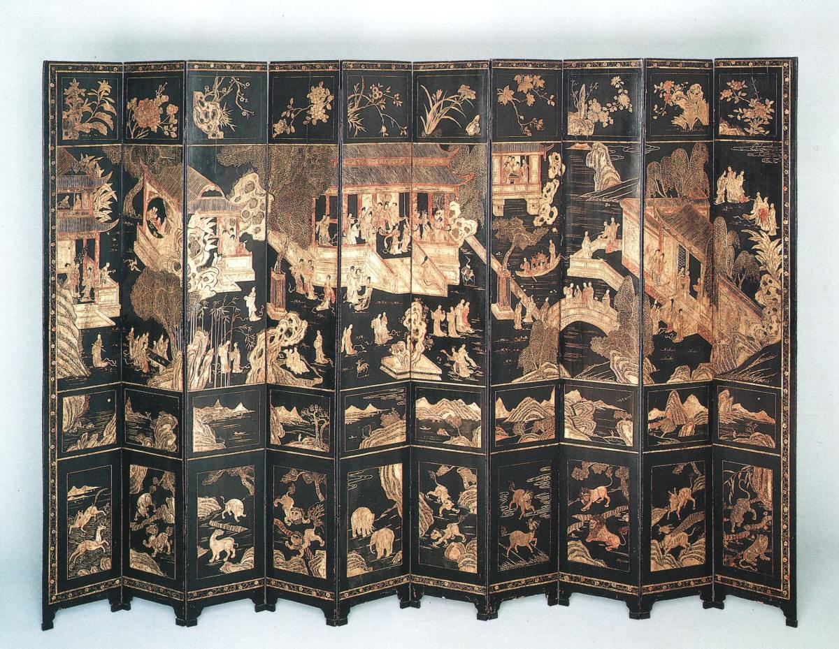 PARAVENT en laque de Coromandel à dix feuilles double face, à décor de scènes de palais au recto et inscription sur fond rouge au verso.