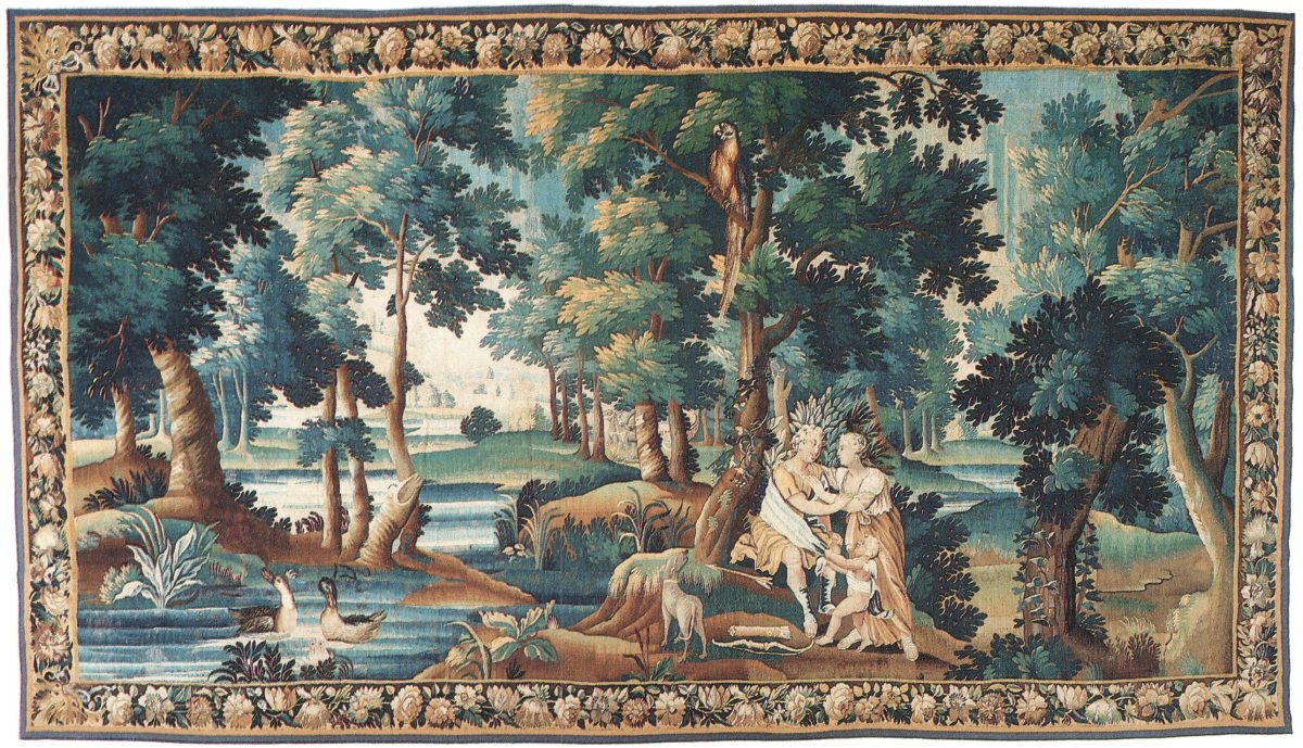 TAPISSERIE des FLANDRES, XVIIIe siècle, représentant : DIANE, ACTÉON et l'AMOUR, dans un paysage de sous-bois animé d'un ruisseau serpentant au milieu des arbres, avec en premier plan des canards.
