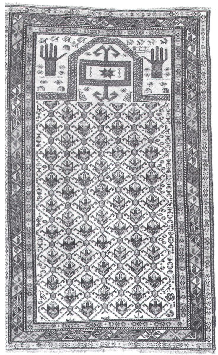 TAPIS DAGHESTAN, Caucase, ancien, sur fond crème à fleurs, à décor de prière et mains de « Fatima », daté: 1328 de l'hégire. Trois bordures dont la principale fond brique.