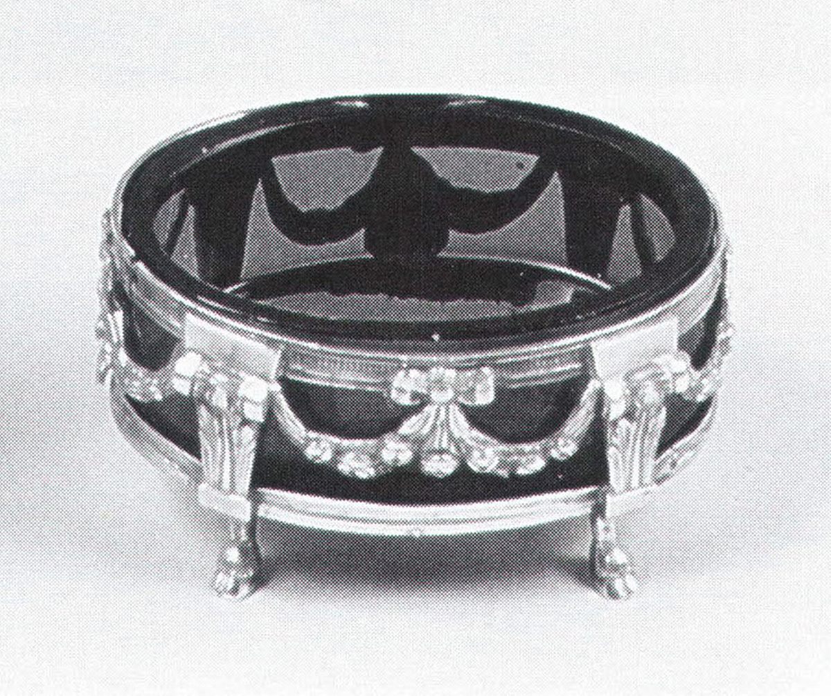 Trois SALIÈRES de forme ovale en argent, chacune d'elles repercée et ciselée de guirlandes de fleurs retenues par des nœuds de ruban et les pilastres à enroulement et feuillages, pose sur quatre pieds sabots. Trois intérieurs en cristal bleu (acc.).