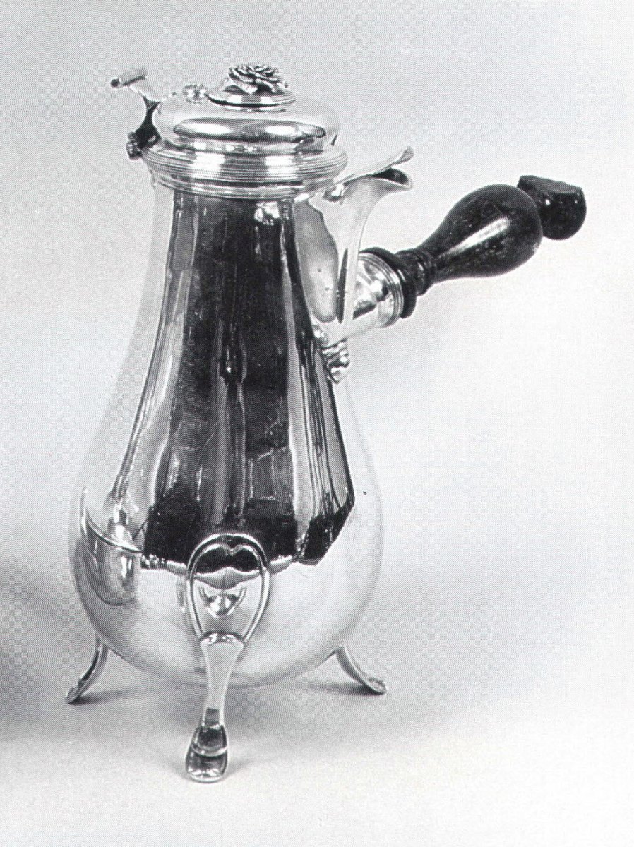 Grande CHOCOLATIÈRE en argent uni à bord fort, pose sur trois pieds à ourlets et ressauts, les attaches en forme de cartouche bordé et agrafé, le bec à culot ceinturé d'une gorge soulignée d'un bouton, le couvercle à poucette et frételet pivotant surmonté d'une fleur. Manche en bois (ace. et mq.).
