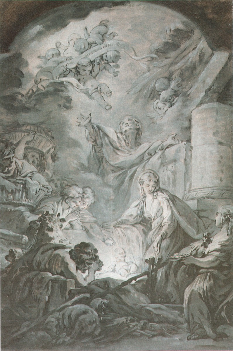 Cette esquisse, inédite, ne correspond à aucune composition picturale connue de François Boucher. Elle peut cependant être rapprochée d'autres dessins de Boucher sur ce thème (La Nativité du musée de Melbourne ou la grisaille préparatoire au tableau qui se trouve au musée de Lyon : La Lumière du Monde) (voir Alexandre Ananoff, François Boucher, Lausanne-Paris, 1976, t. II, p. 64, n° 362).
