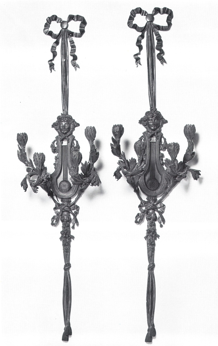 Curieuse PAIRE D'APPLIQUES à quatre lumières, en bronze ciselé et doré, à décor de feuilles de laurier, masques, lyres, rubans, draperies, fleurs et fruits.