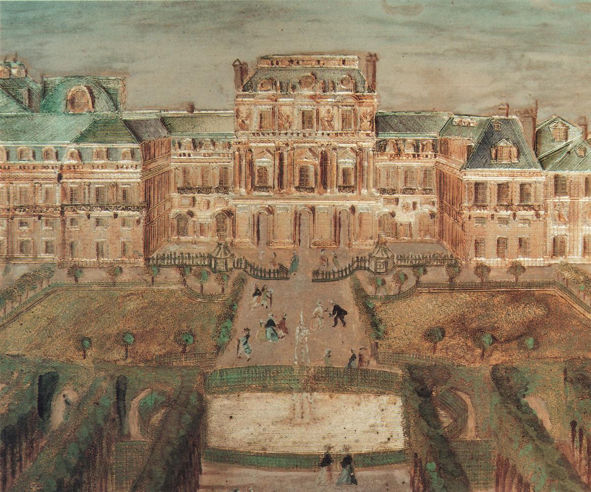 Très rare et exceptionnelle PAIRE DE TABLEAUX exécutés par COMPIGNÉ, représentant une vue du Palais-Royal, avec jardins animés, et une vue du Palais-Bourbon, avec bateaux sur la Seine et très nombreux personnages. Cadres en bois doré et mouluré. (Petits accidents et petites restaurations.)