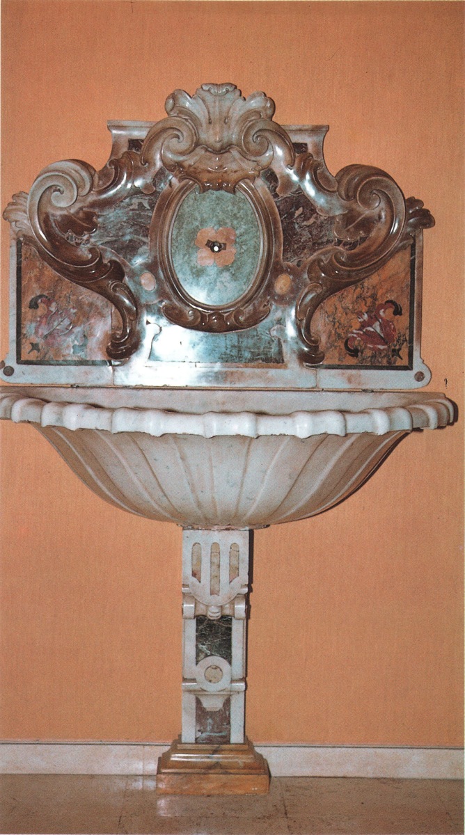 FONTAINE MURALE, en marbre blanc et marqueterie de marbres polychromes. Vasque en forme de coquille. Elle repose sur un pied en console à volutes, et est surmontée d'un fronton mouvementé à décor de feuilles d'acanthe, aux écoinçons ornés de fleurs stylisées.
