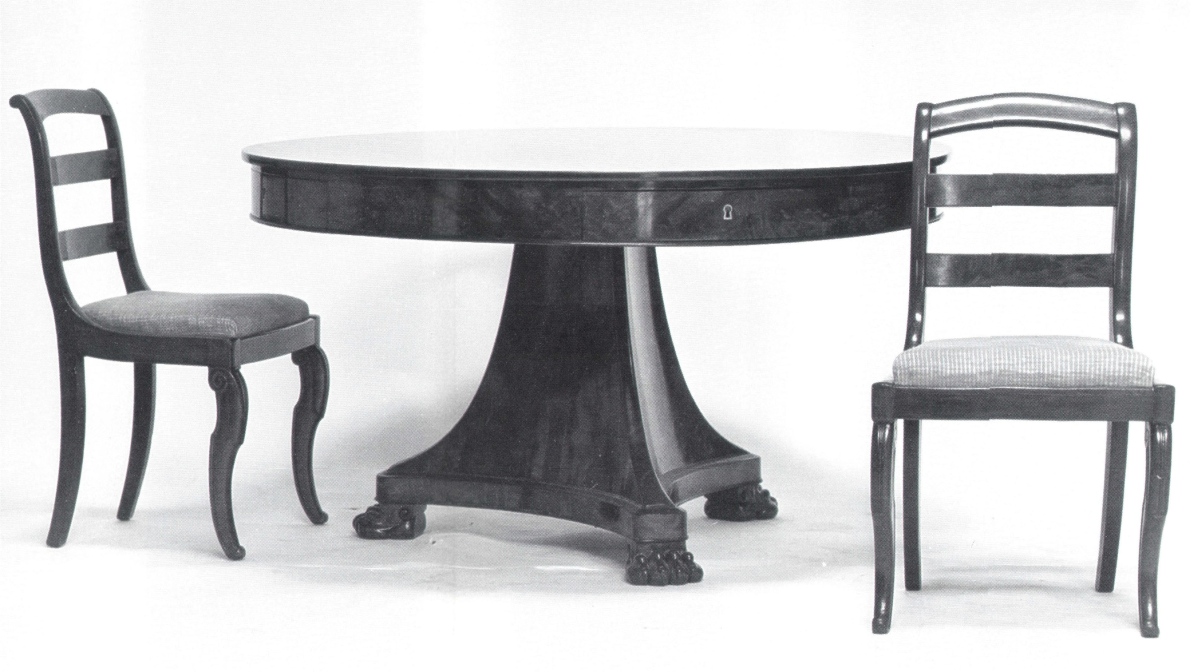 Grande TABLE ronde, en acajou mouluré et placage d'acajou; elle repose sur des pieds griffes réunis par une base triangulaire évidée; elle ouvre par quatre tiroirs.