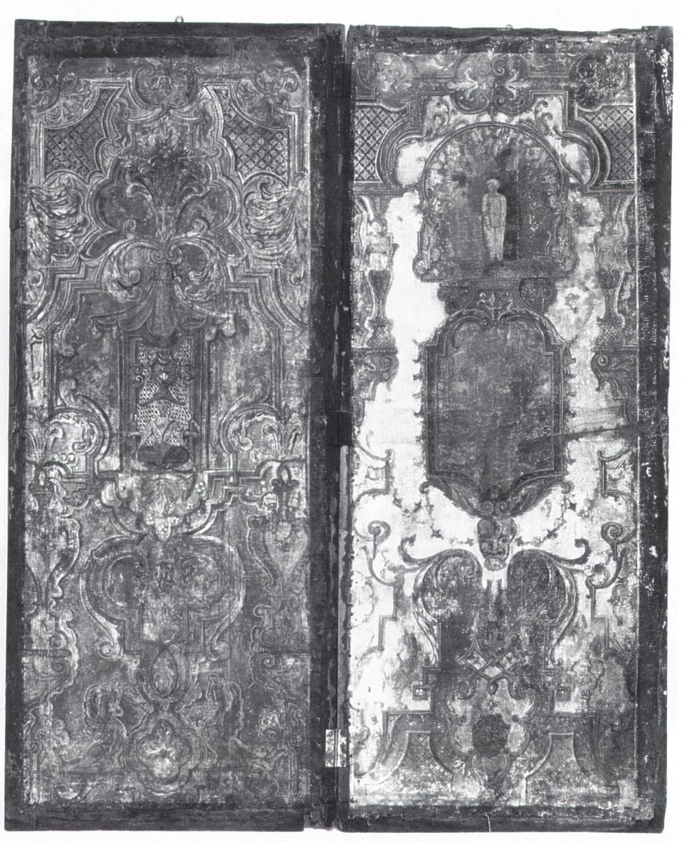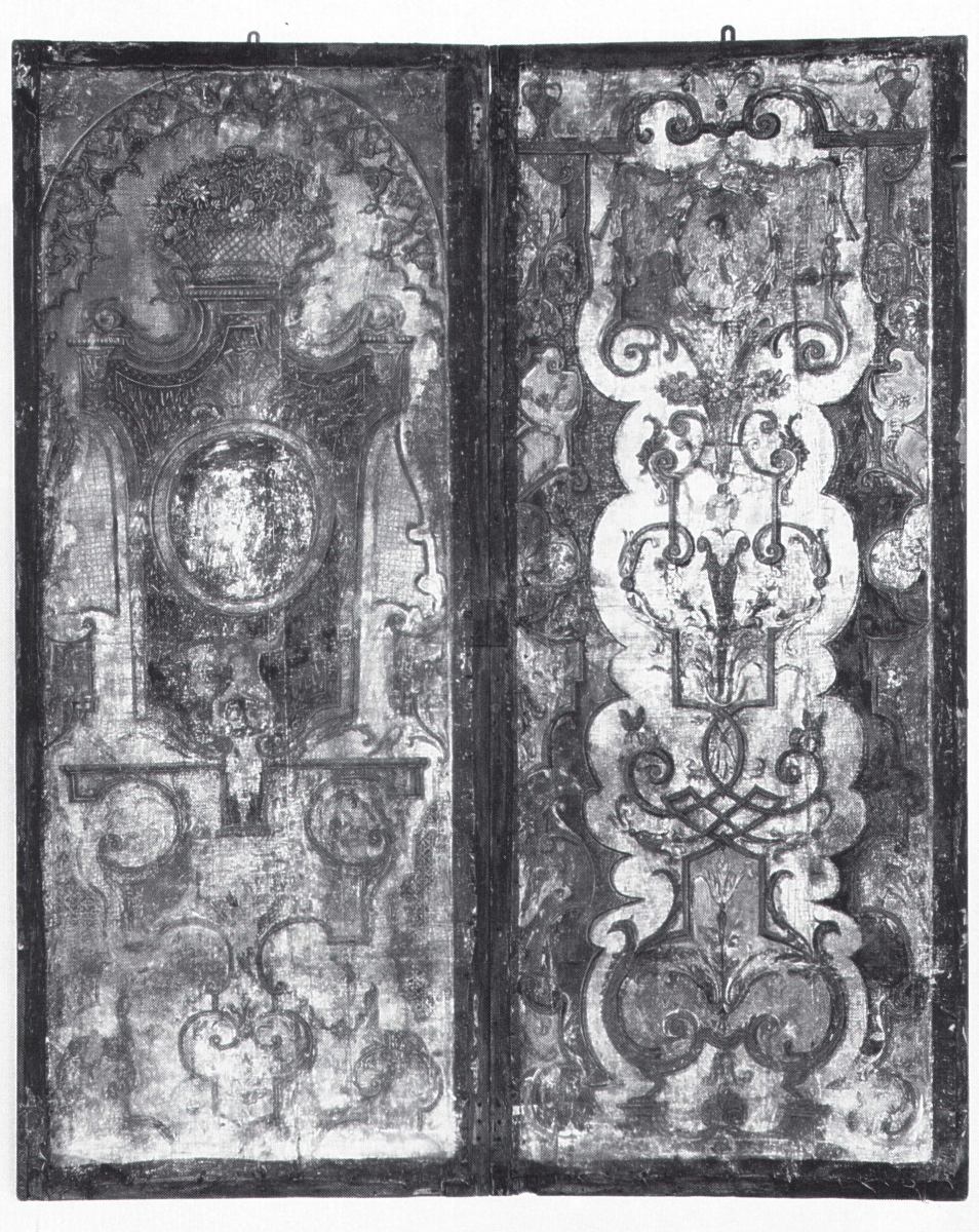 PARAVENT à quatre feuilles, à monture de bois partiellement peint. Il est garni de toiles peintes sur les deux faces à décor de personnages, rinceaux et feuillages dans le goût de Salambier ou de la Comèdia del'Arte.