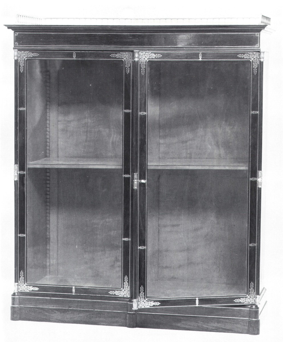Belle VITRINE à deux portes, en placage de palissandre et filets de cuivre, rinceaux fleuris et feuillagés, et rosaces. Montants à petites colonnes à bagues. Dessus à galerie à colonnettes en bronze doré.