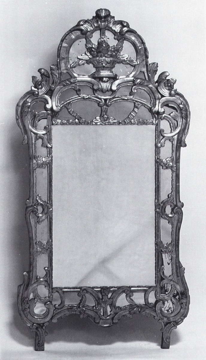 Petite GLACE dans un double cadre en bois sculpté et doré, à décor de vase fleuri, rinceaux et feuillages.