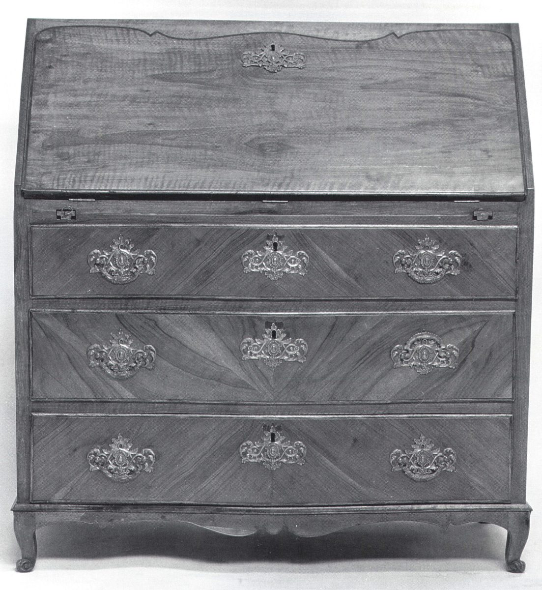 BUREAU DE PENTE formant commode en placage de noyer, bois naturel et bois laqué noir; l'abattant dissimule cinq petits tiroirs, une porte et des casiers; trois tiroirs en façade. Petits pieds cambrés. Ornements de bronze à rinceaux feuillagés.