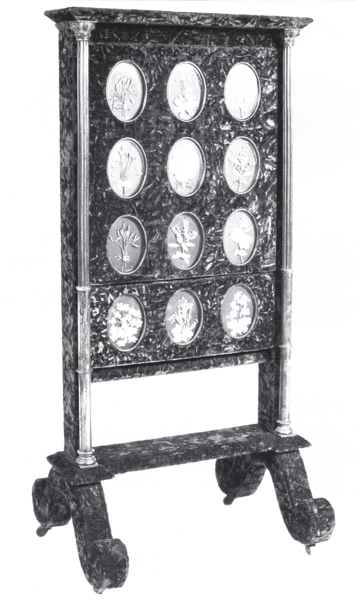 Curieux SECRÉTAIRE BILLET DOUX en bois recouvert de velours rouge et montants à colonnes cannelées détachées en bronze doré. Il présente sur les deux faces douze réserves ovales avec fleurs séchées ou de tissus. L'intérieur découvert par l'abattant offre des casiers à soufflets.