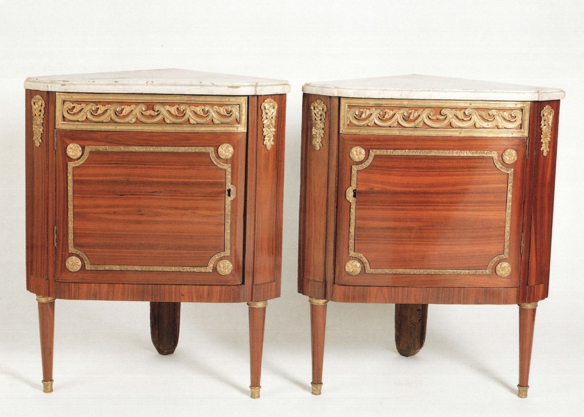 Belle PAIRE D'ENCOIGNURES en placage de satiné et bois de placage. Elles ouvrent par une porte qui dissimule des tablettes. Belle ornementation de bronzes ciselés et dorés à décor de rosaces, frise d'entrelacs, bagues, chutes de fleurs sur les montants plats, et encadrements. Pieds fuselés à sabots (chutes rapportées).