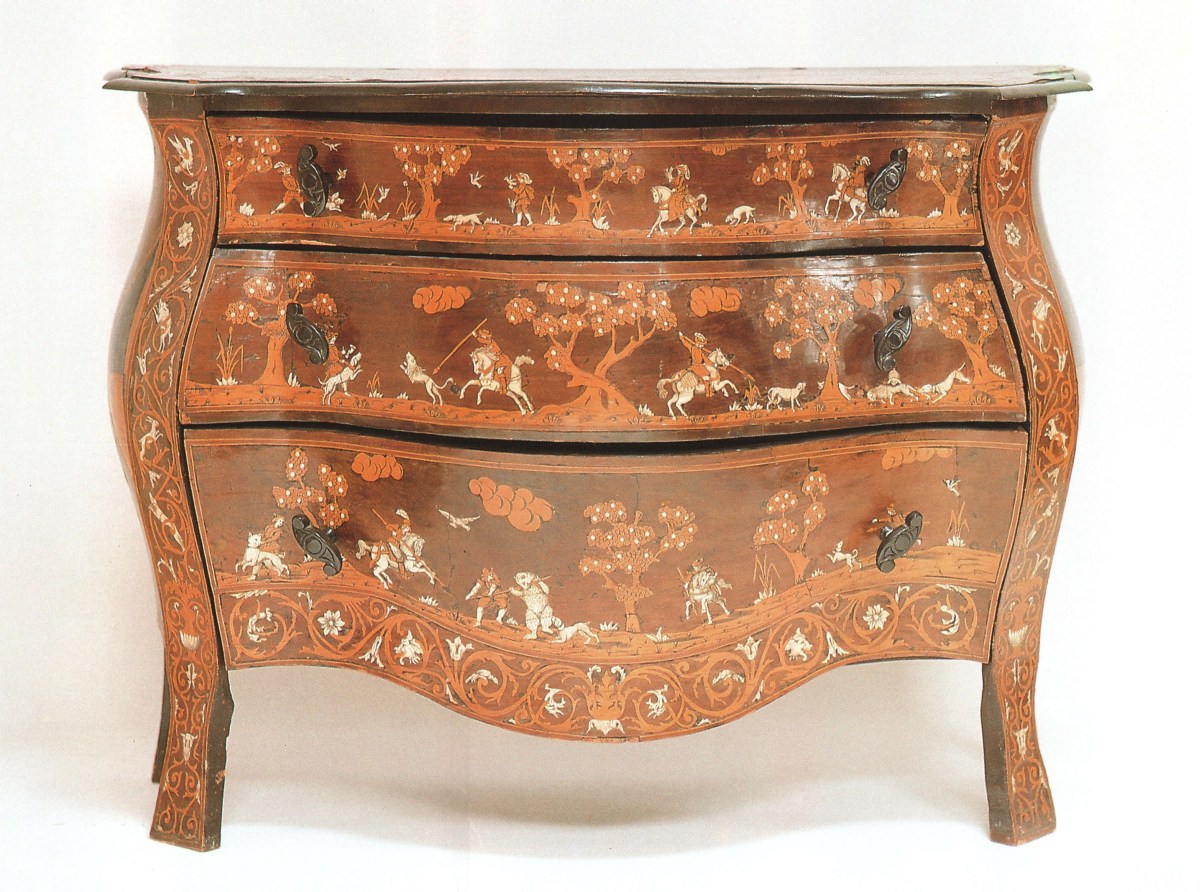 Rare et curieuse COMMODE galbée dite « de chasse », elle présente trois tiroirs inégaux et repose par des montants et des pieds plats. Elle est en placage de bois indigènes, bois naturel, bois laqué noir et rehauts d'ivoire. Elle est ornée sur le dessus et la face de nombreuses scènes de chasse à courre, au faucon ou à l'épieu dans des paysages. Sur les côtés, de grands losanges.