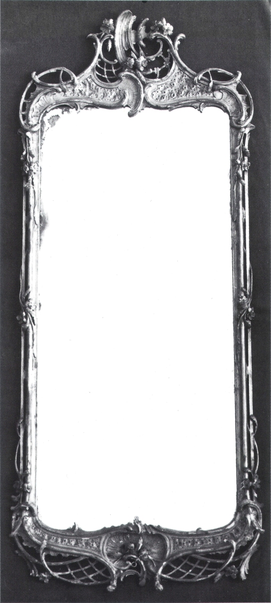 GLACE rectangulaire dans un cadre en bois doré et sculpté à décor ajouré de treillages, rinceaux, fleurettes et feuillages.