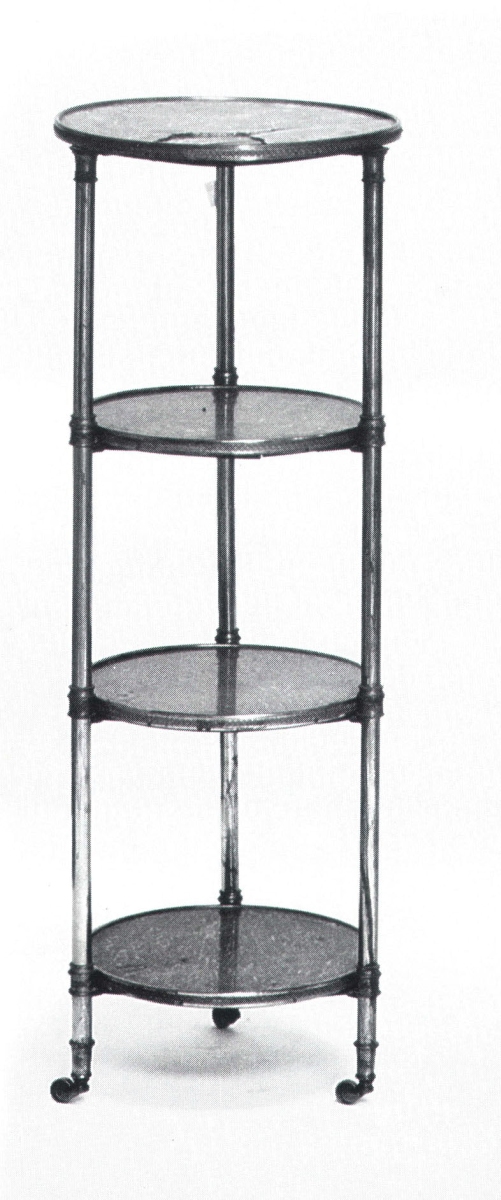 Curieuse SELLETTE en acajou et ébène à décor en filets de cuivre de losanges et encadrements. Elle repose sur trois pieds cambrés réunis par une tablette ronde. Dessus de marbre vert encastré.