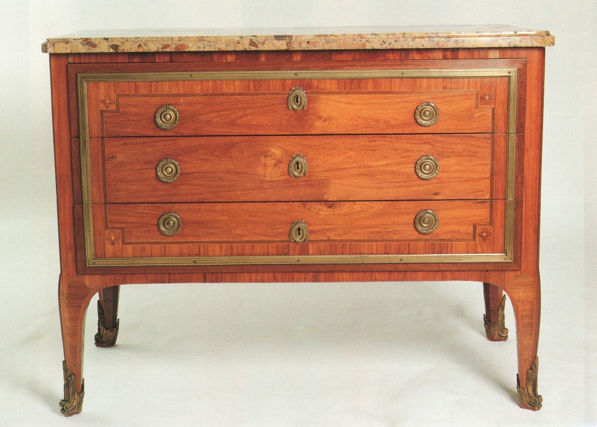 Importante COMMODE à trois tiroirs sans traverse. Elle est en placage de bois de rose, encadrement de filets de bois clair et marqueté de rosaces sur les côtés et la façade. Elle est ornée de bronzes ciselés et dorés, entrées de serrures, poignées de tirage, encadrements et sabots à volutes feuilIagées. Pieds cambrés.