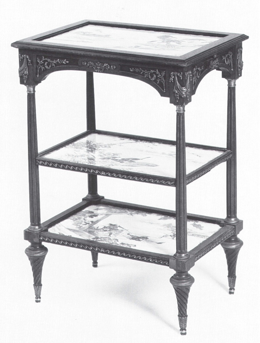 TABLE SERVANTE rectangulaire à trois plateaux, en bois naturel à deux tirettes latérales foncées de cuir, les plateaux foncés de plaques en porcelaine de Chine (accident à l'une d'elles) à décor polychrome et or de paysages, oiseaux et personnages. Ornementation de bronzes ciselés et dorés à frise de postes, draperies, rinceaux et feuillages; montants et pieds fuselés à cannelures torses.