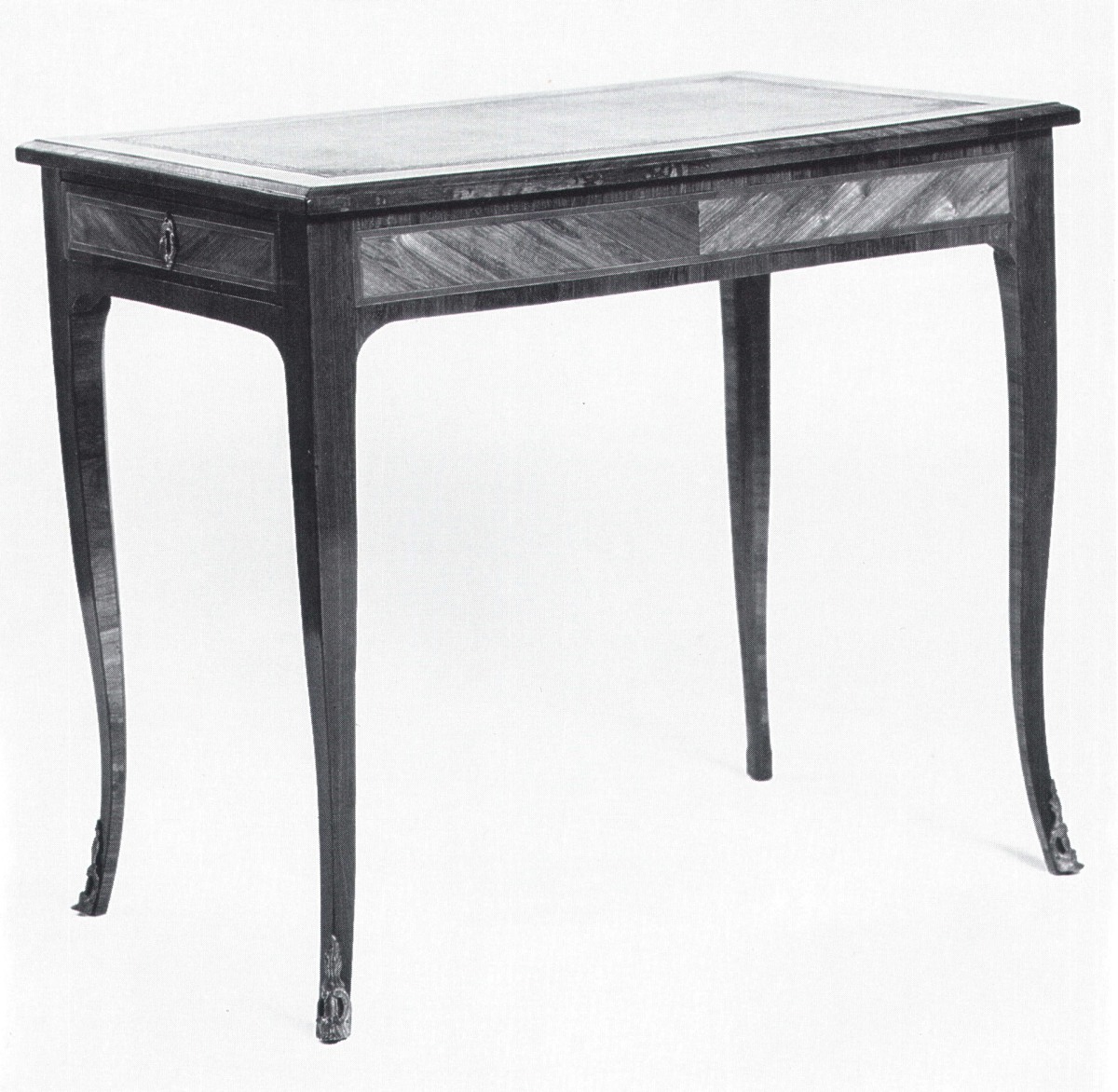Petite TABLE RECTANGULAIRE en placage de bois de rose marqueté en feuilles dans des encadrements à filets de buis et de palissandre. Elle ouvre par un tiroir latéral formant écritoire. Pieds légèrement cambrés. Entrée de serrure et sabots de bronze.