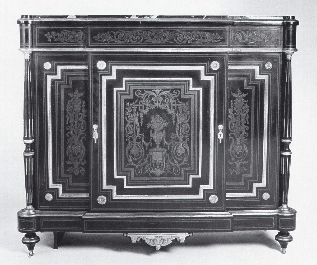 MEUBLE D'ENTRE-DEUX à ressaut, ouvrant par une porte qui découvre des tablettes. Il est en bois laqué noir, cuivre gravé et bronze doré à vase fleuri, rinceaux, feuillages et lambrequins. Montants à colonnes détachées, fuselées et cannelées; pieds toupies. Dessus de marbre portor encastré.