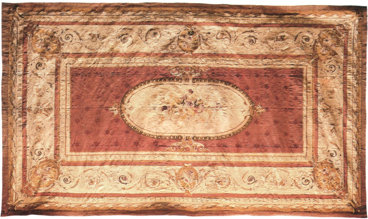 TAPIS D'AUBUSSON, époque Louis-Philippe, fond vieux rose, parsemé d'étoiles, médaillon et large bordure crème à bouquets de fleurs et rinceaux.