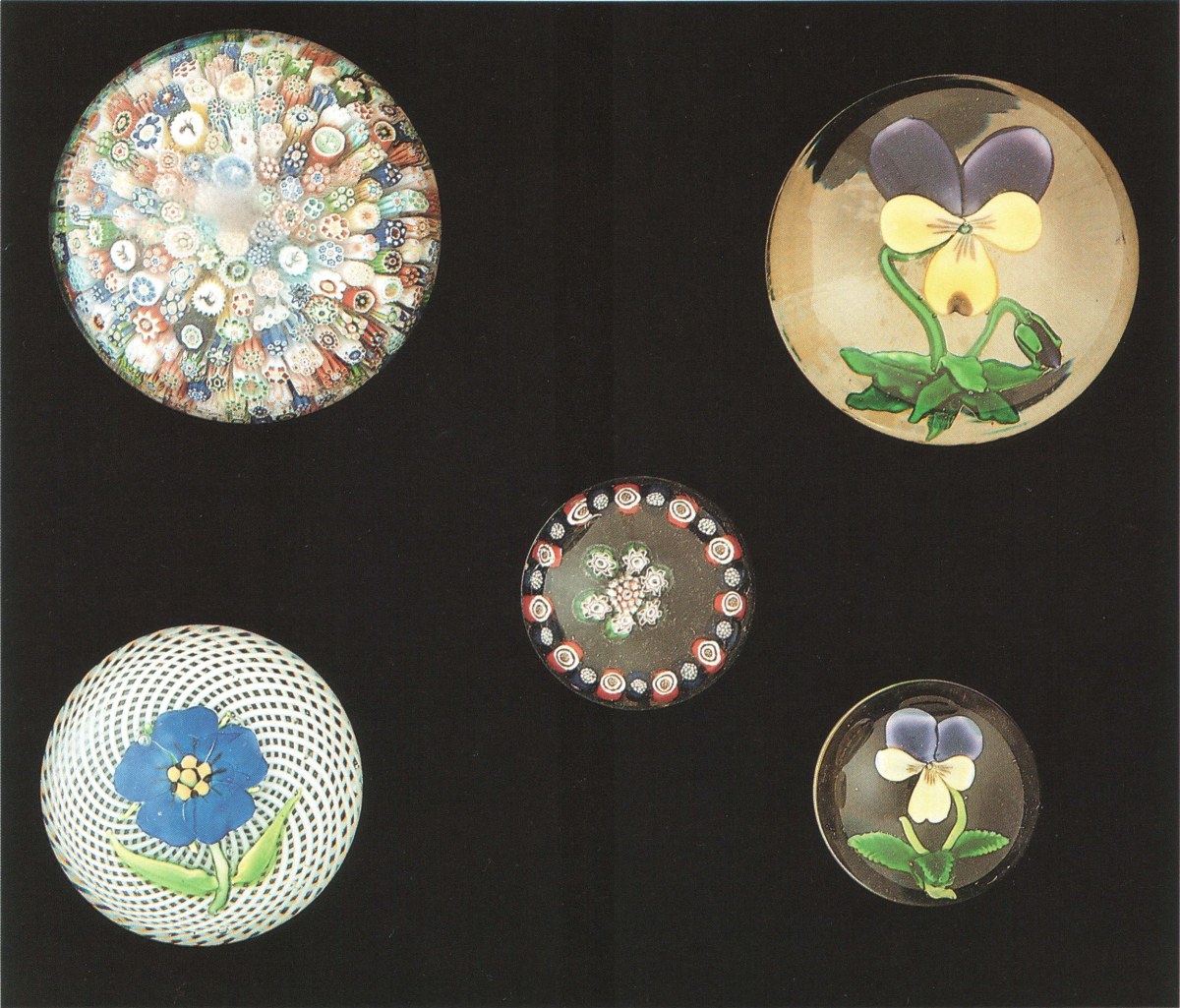 ENSEMBLE DE CINQ BOULES PRESSE-PAPIER à décor de millefiori, pensée...