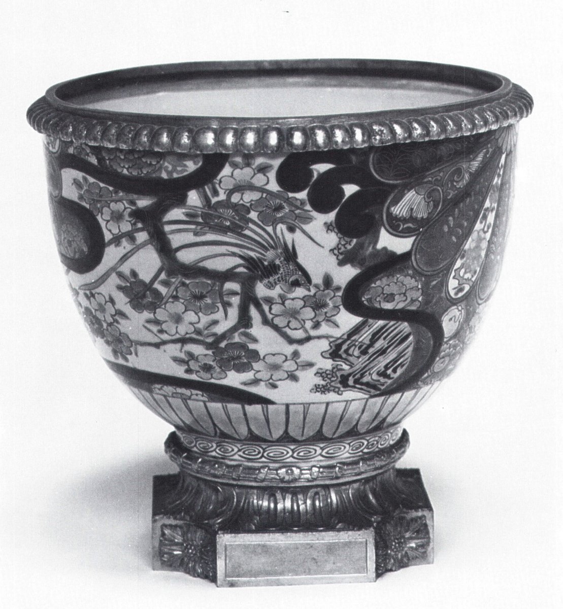 JAPON : VASQUE en porcelaine de la fin du XVIIIe ou du début du XIXe siècle à décor polychrome et or d'oiseaux stylisés, fleurs, feuillages et palmes. Monture en bronze doré à côtes et rosaces du XIXe siècle.