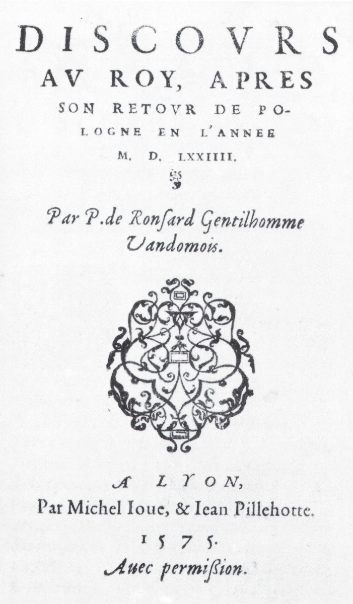 L'édition comprend le Discours proprement dit, suivi d'un Sonnet à la Royne de Navarre, sœur de Charles IX et d'Henri III, et ambassadrice de Ronsard auprès du roi : (...) S'il vous plaist de mes vers présenter la lecture Au Roy mon nouveau maistre, à qui mon tout je doy, Recommander ma Muse & lui parler de moy (...)