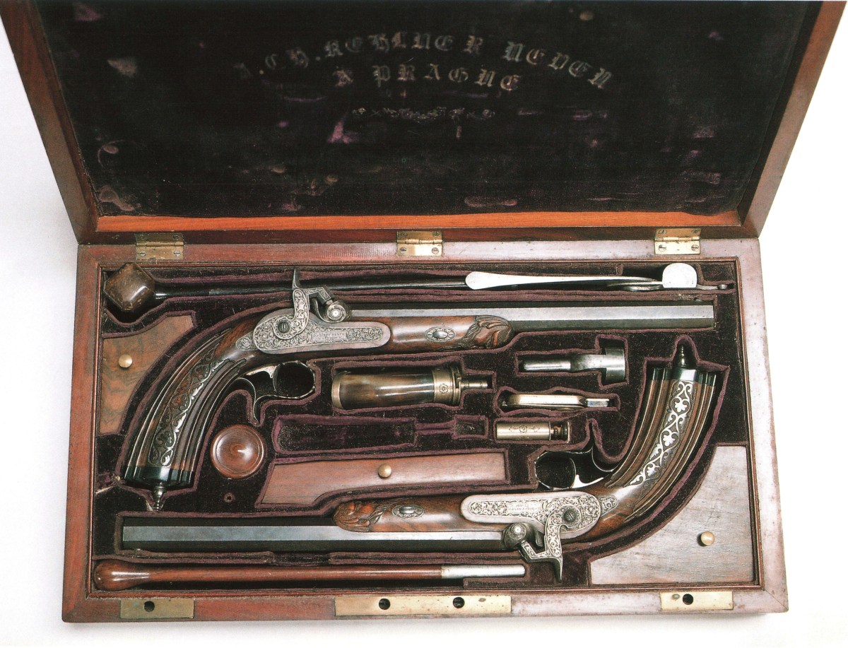 Paire de PISTOLETS d'officier, canons à pans, rayés, signés sur le dessus « KEHLMER NEVEU À PRAGUE », gravés aux tonnerres avec crans de mire réglables et aux queues de culasses, platines avant signées « KEHLMER NEVEU À PRAGUE », chiens, à corps plats, et garnitures en fer découpé finement gravé de feuillages et rinceaux, pontets repose-doigt, crosses en noyer choisi à calottes en corne sculpté, fûts décorés à l'avant de masques de vieillards extrême-orientaux.