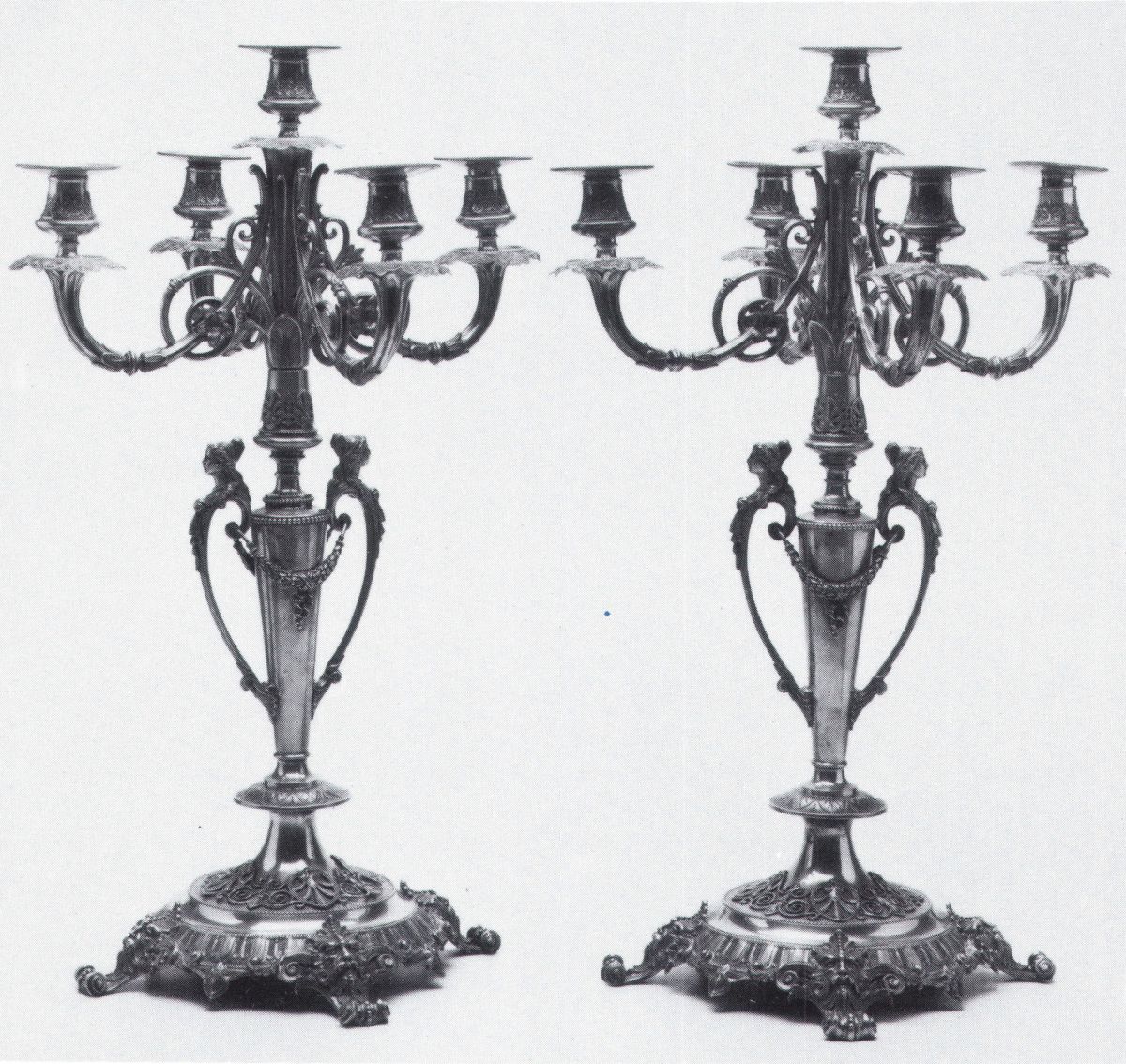 Paire de grands CANDÉLABRES à bouquet de cinq lumières en argent. Chacun d'eux pose sur un socle. rond à quatre pieds repercés d'enroulements, perles et masques de grotesques, la doucine appliquée de rinceaux, surmontée du fût tronconique uni encadré de termes, guirlandes et du bouquet à quatre bras à décor d'enroulements, fleurs et cornets supportant les binets et bobèches, ils entourent la chandelle au centre.